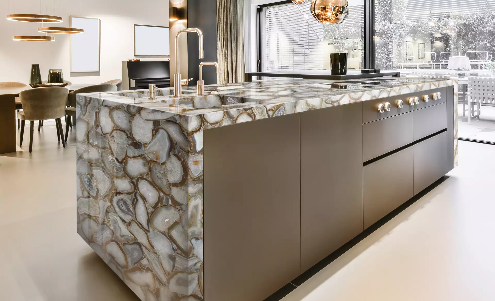 Semi-precious stone countertops: the ultimate elegance, combining both luxury and durability. Each piece is carefully handcrafted to deliver an exclusive design that will transform your space into an oasis of beauty. Let yourself be seduced by the beauty of our high-end countertops.